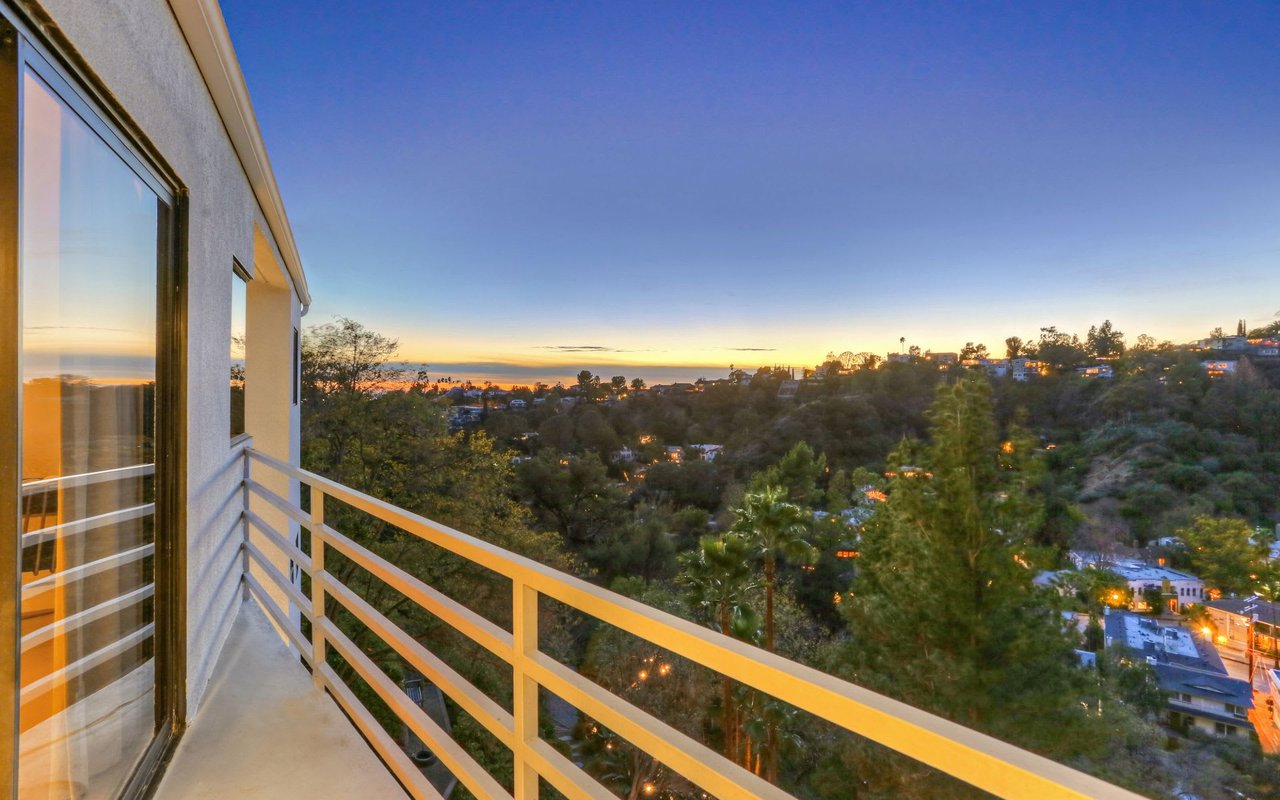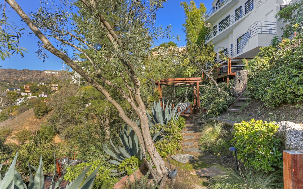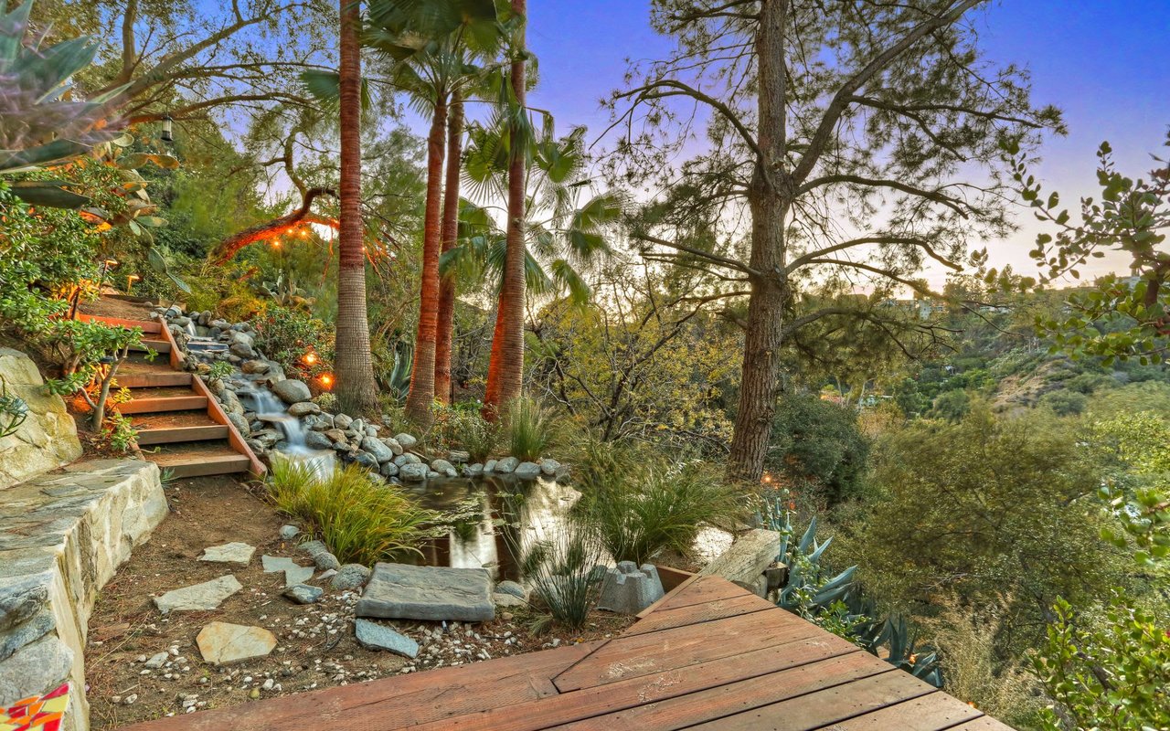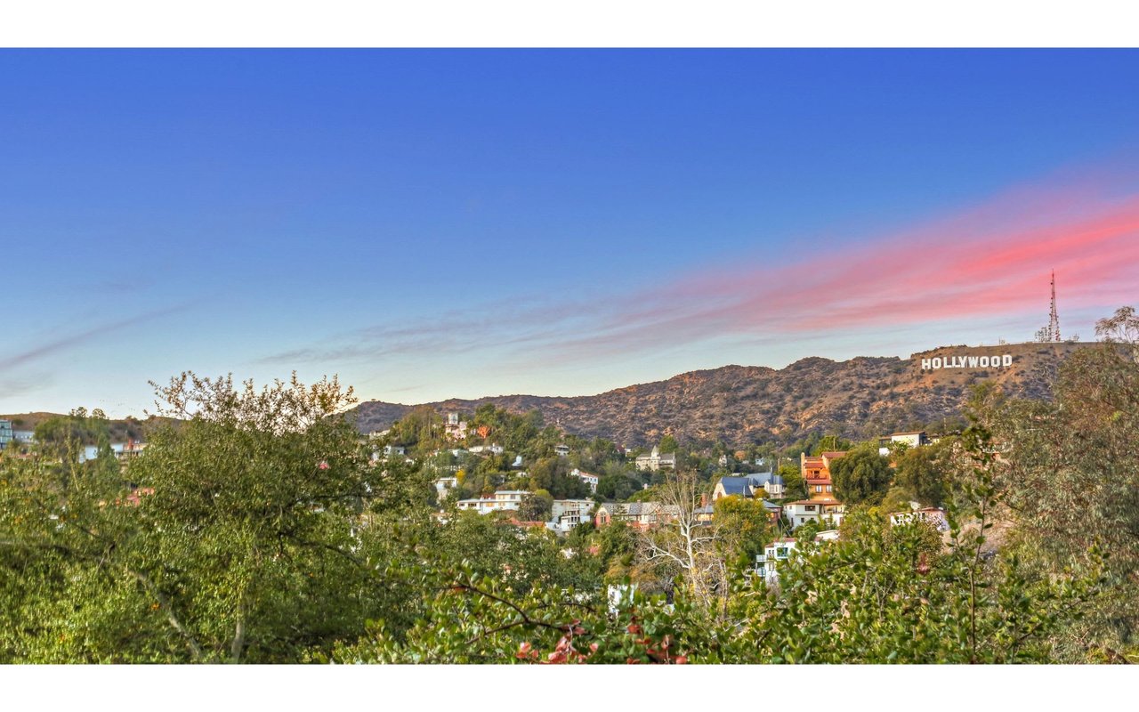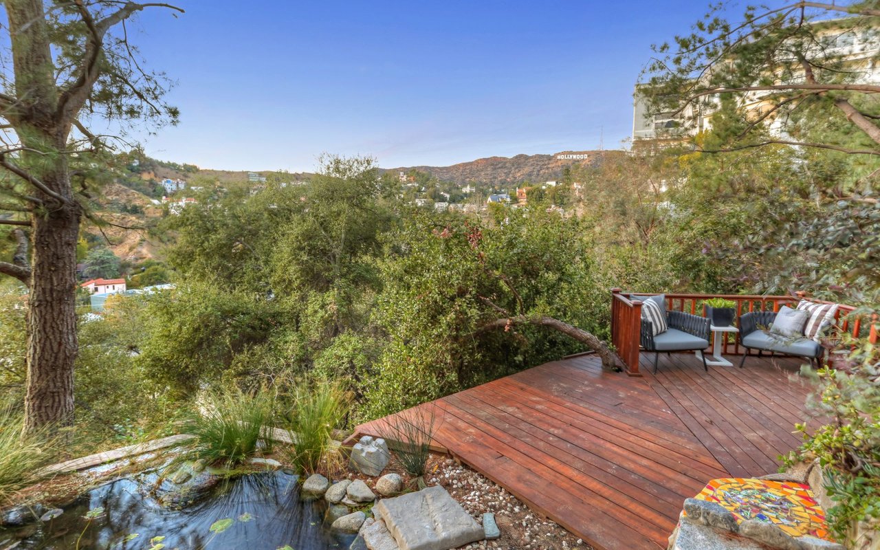 Outstanding modern architectural with design additions styled by the lead architect for the world famous New Berlin Museum. Huge light and airy rooms accented with cubic and volume height scale framed by sweeping views. Sleek newer kitchen with top of the line chef's appliances and wine storage. Movie theatre, loft like master suite with a highly crafted and dramatic floating soaking bath and over size shower. Sleek guest bath with rain shower. Open air office. Decks, terraces, koi pond, stream, croquet area and beautifully landscaped gardens, park like grounds and outdoor areas complete this tour de force. Brilliant views of Hollywoodland, Wolfs Lair, the sign and the canyon. An amazing opportunity.