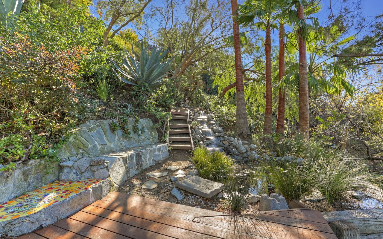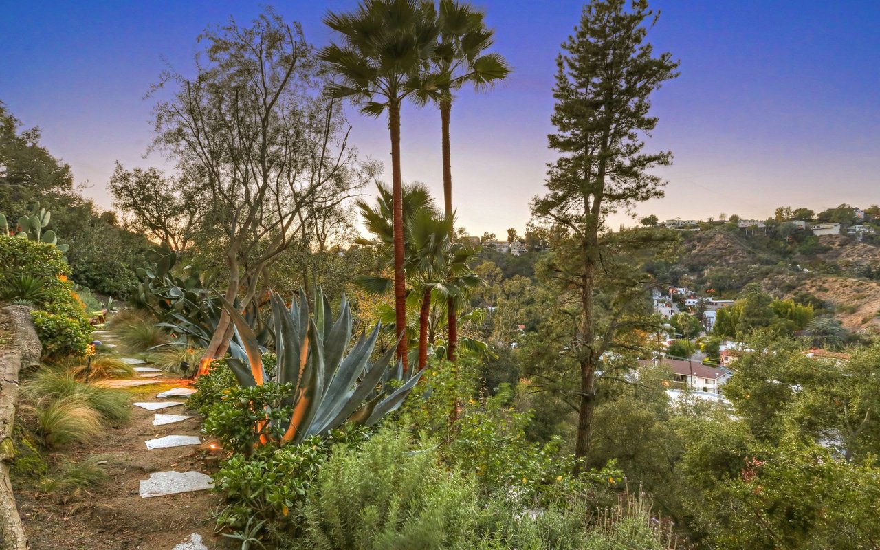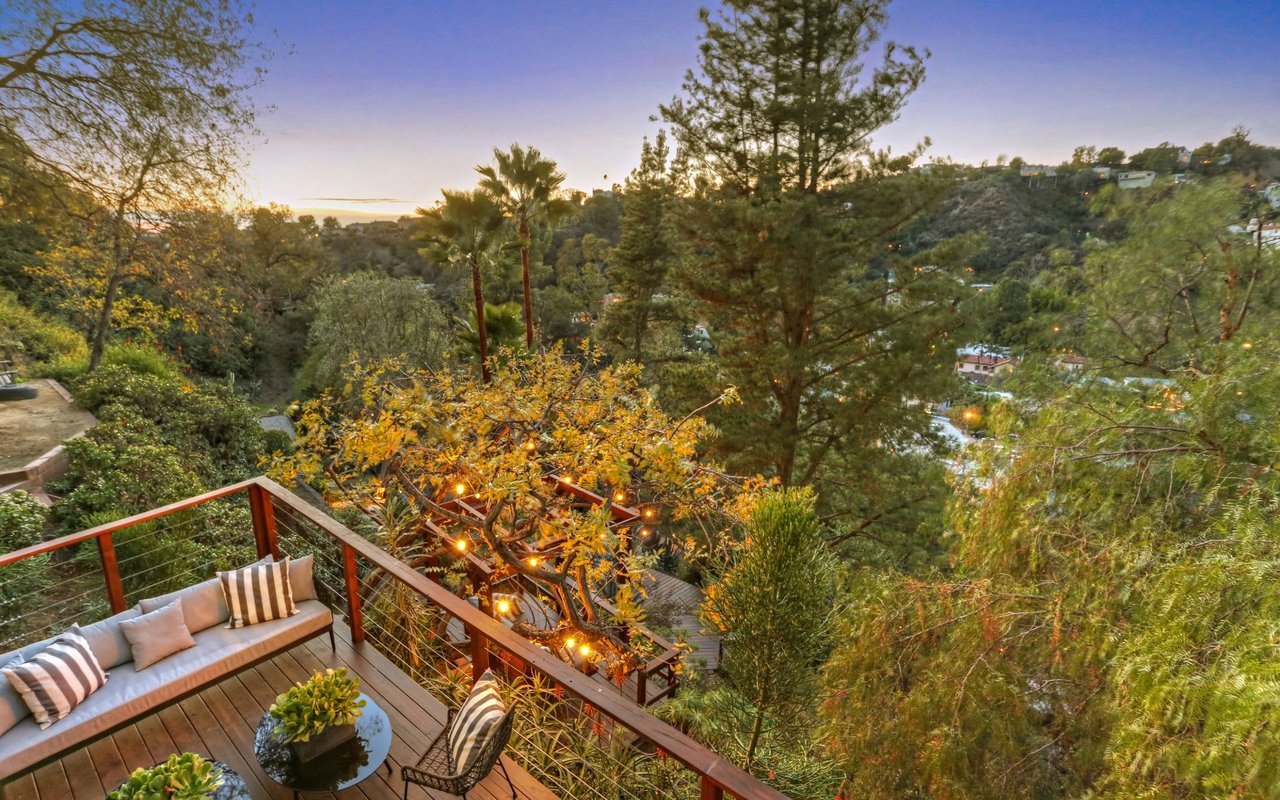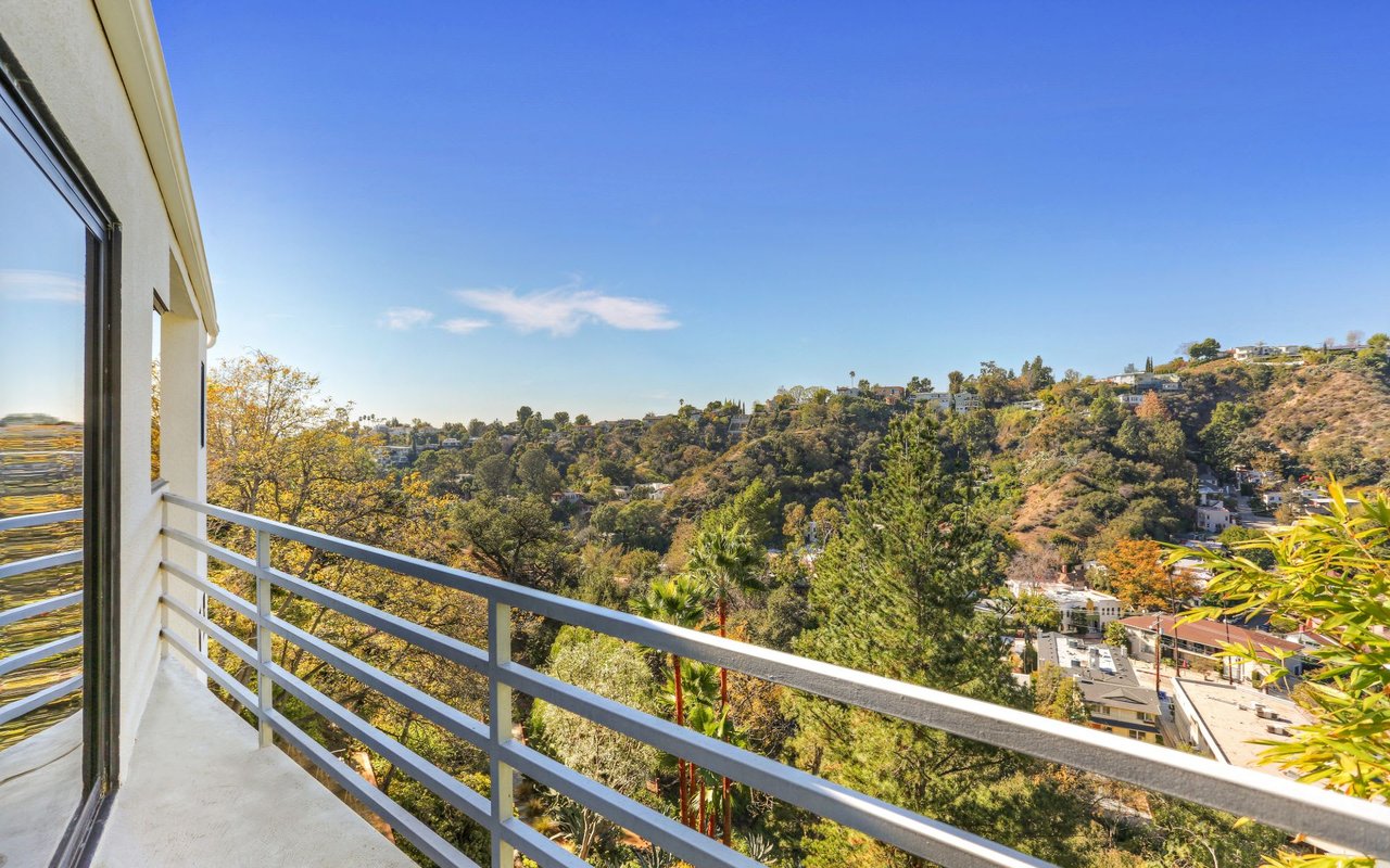 Outstanding modern architectural with design additions styled by the lead architect for the world famous New Berlin Museum. Huge light and airy rooms accented with cubic and volume height scale framed by sweeping views. Sleek newer kitchen with top of the line chef's appliances and wine storage. Movie theatre, loft like master suite with a highly crafted and dramatic floating soaking bath and over size shower. Sleek guest bath with rain shower. Open air office. Decks, terraces, koi pond, stream, croquet area and beautifully landscaped gardens, park like grounds and outdoor areas complete this tour de force. Brilliant views of Hollywoodland, Wolfs Lair, the sign and the canyon. An amazing opportunity.