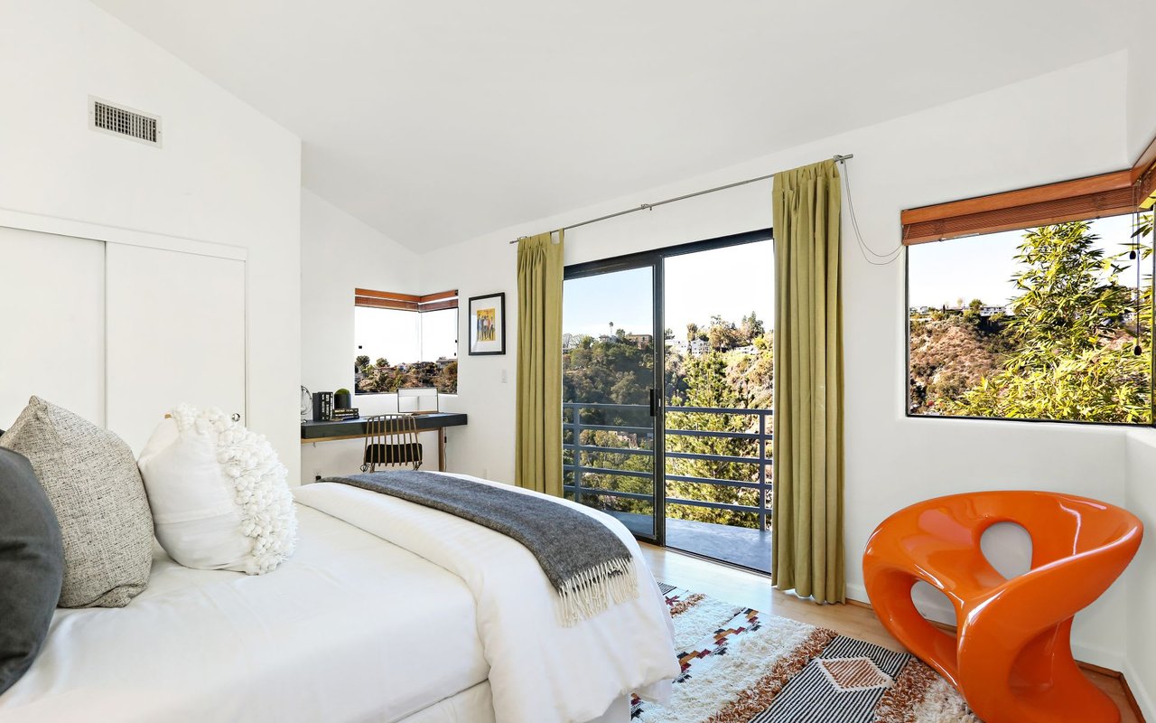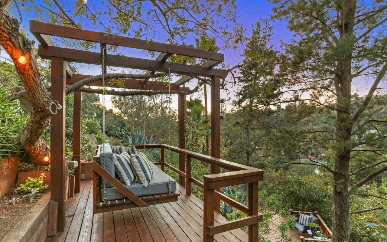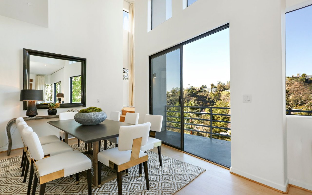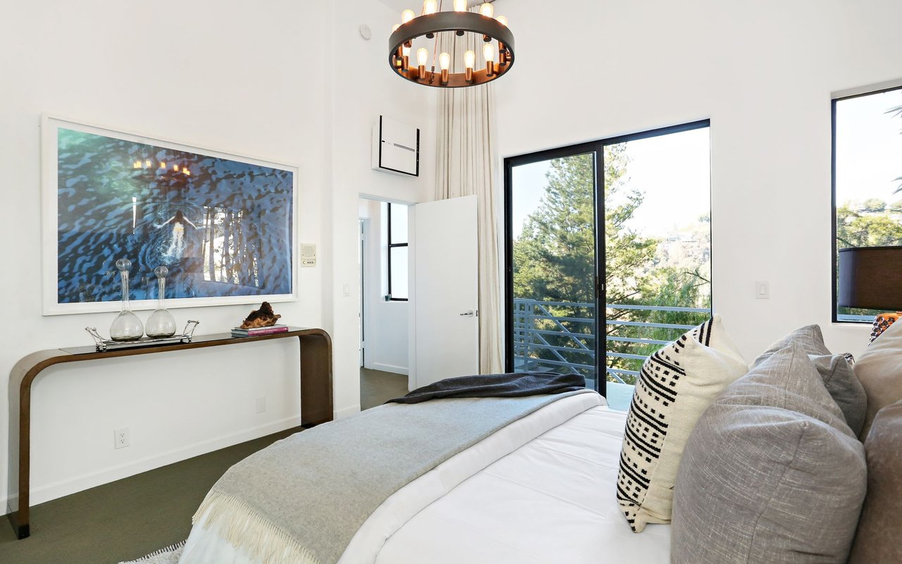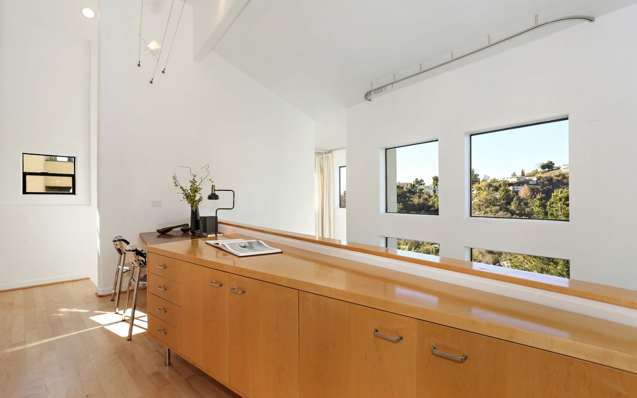 Outstanding modern architectural with design additions styled by the lead architect for the world famous New Berlin Museum. Huge light and airy rooms accented with cubic and volume height scale framed by sweeping views. Sleek newer kitchen with top of the line chef's appliances and wine storage. Movie theatre, loft like master suite with a highly crafted and dramatic floating soaking bath and over size shower. Sleek guest bath with rain shower. Open air office. Decks, terraces, koi pond, stream, croquet area and beautifully landscaped gardens, park like grounds and outdoor areas complete this tour de force. Brilliant views of Hollywoodland, Wolfs Lair, the sign and the canyon. An amazing opportunity.