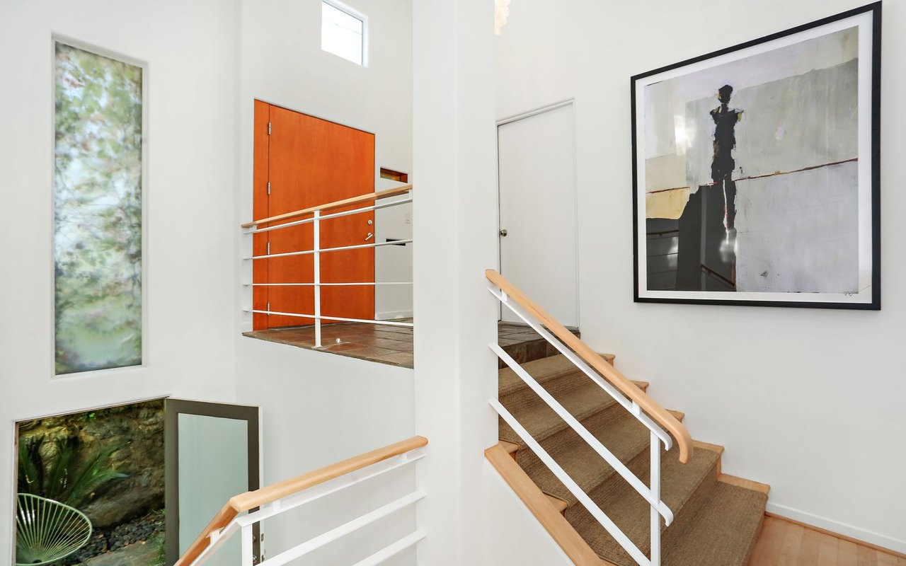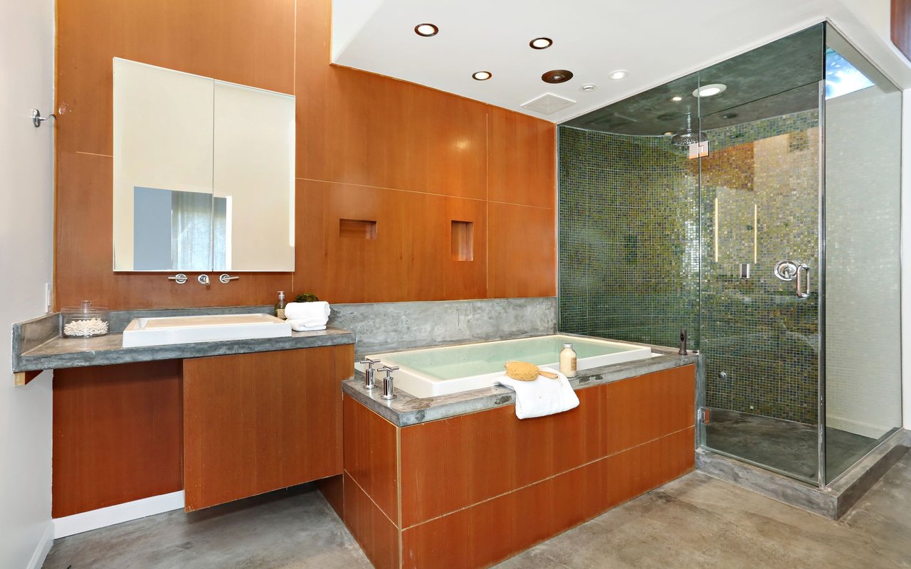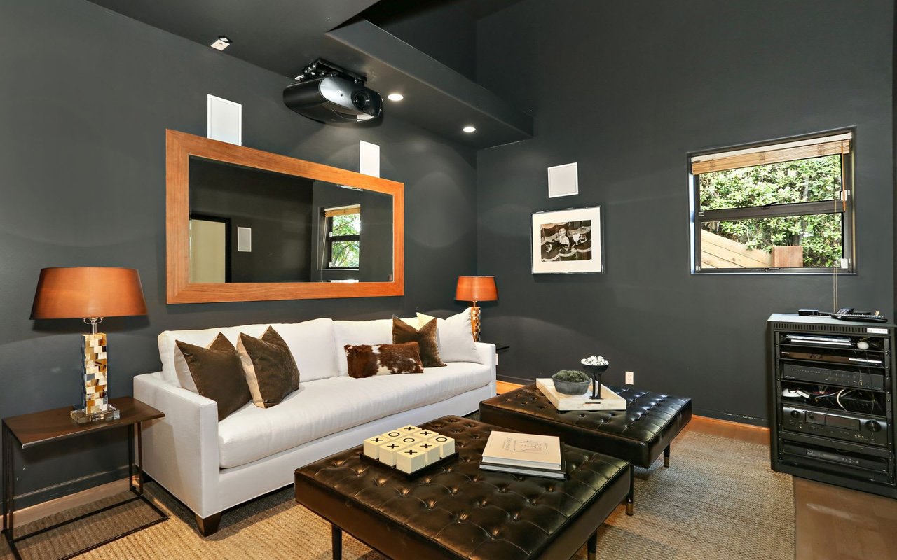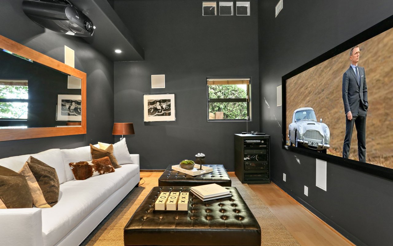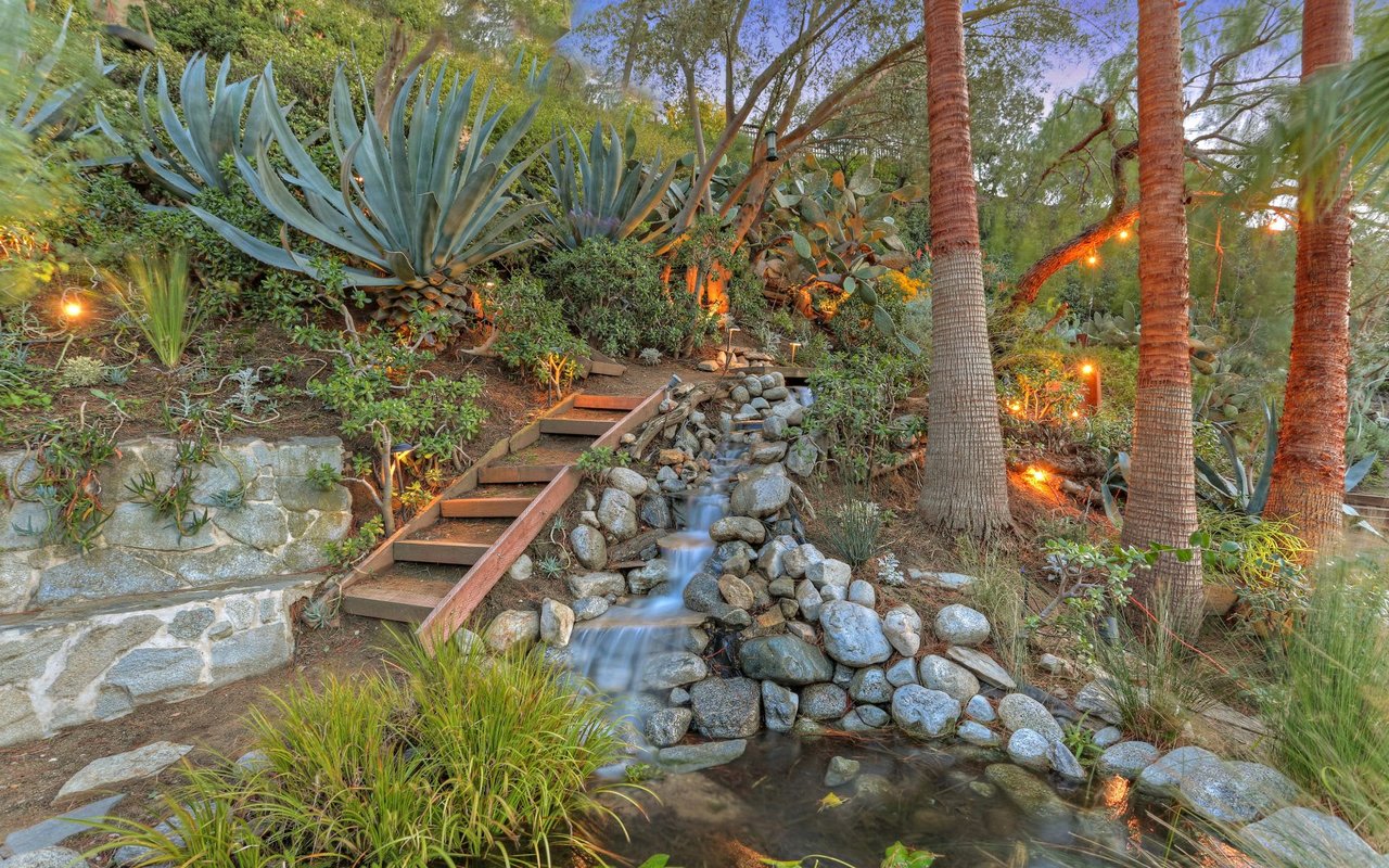 Outstanding modern architectural with design additions styled by the lead architect for the world famous New Berlin Museum. Huge light and airy rooms accented with cubic and volume height scale framed by sweeping views. Sleek newer kitchen with top of the line chef's appliances and wine storage. Movie theatre, loft like master suite with a highly crafted and dramatic floating soaking bath and over size shower. Sleek guest bath with rain shower. Open air office. Decks, terraces, koi pond, stream, croquet area and beautifully landscaped gardens, park like grounds and outdoor areas complete this tour de force. Brilliant views of Hollywoodland, Wolfs Lair, the sign and the canyon. An amazing opportunity.
