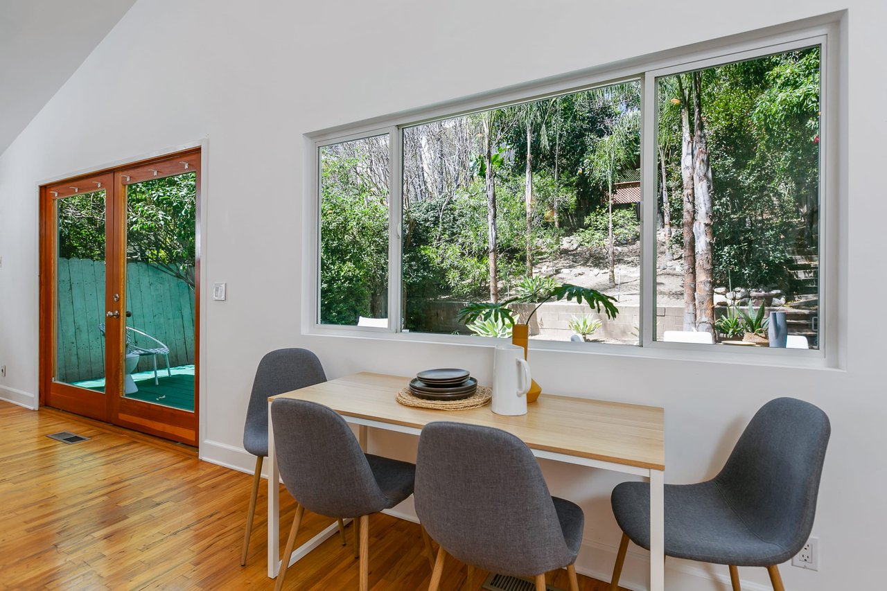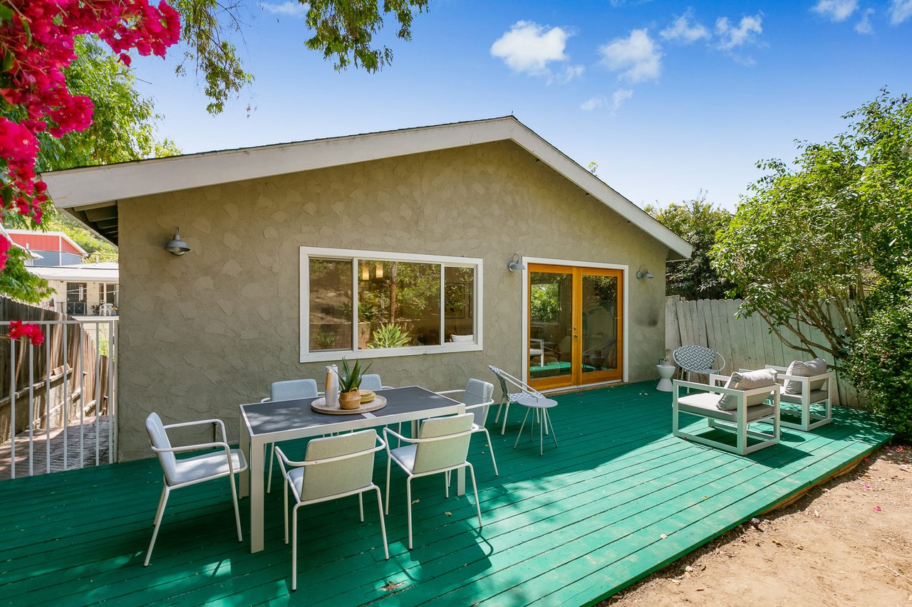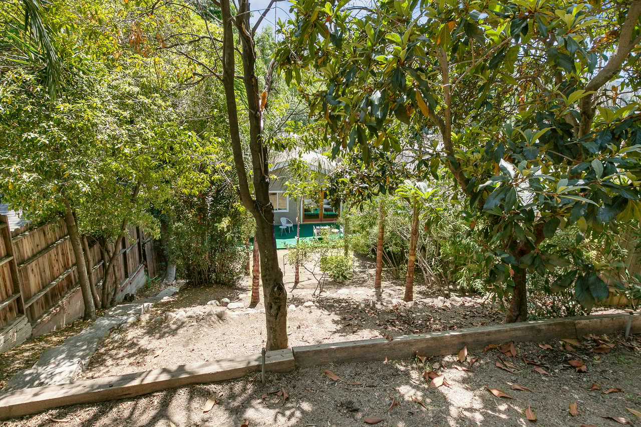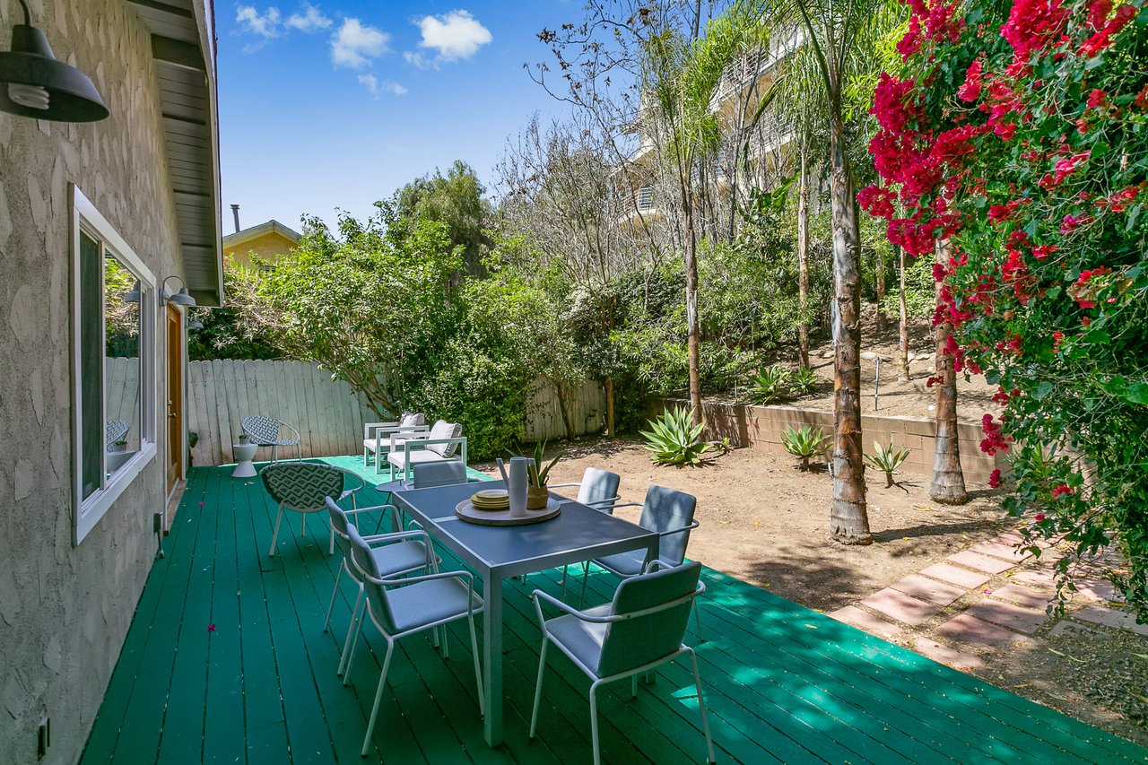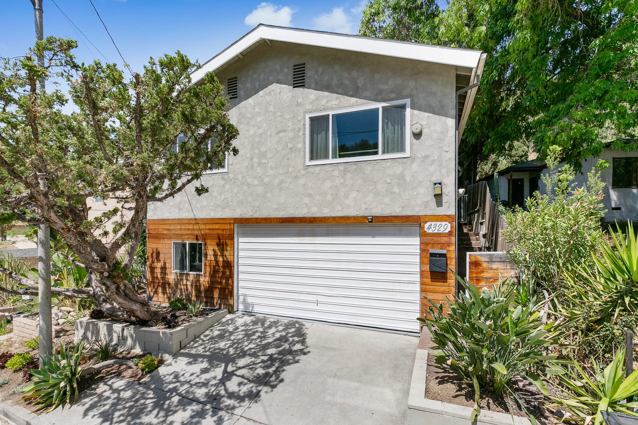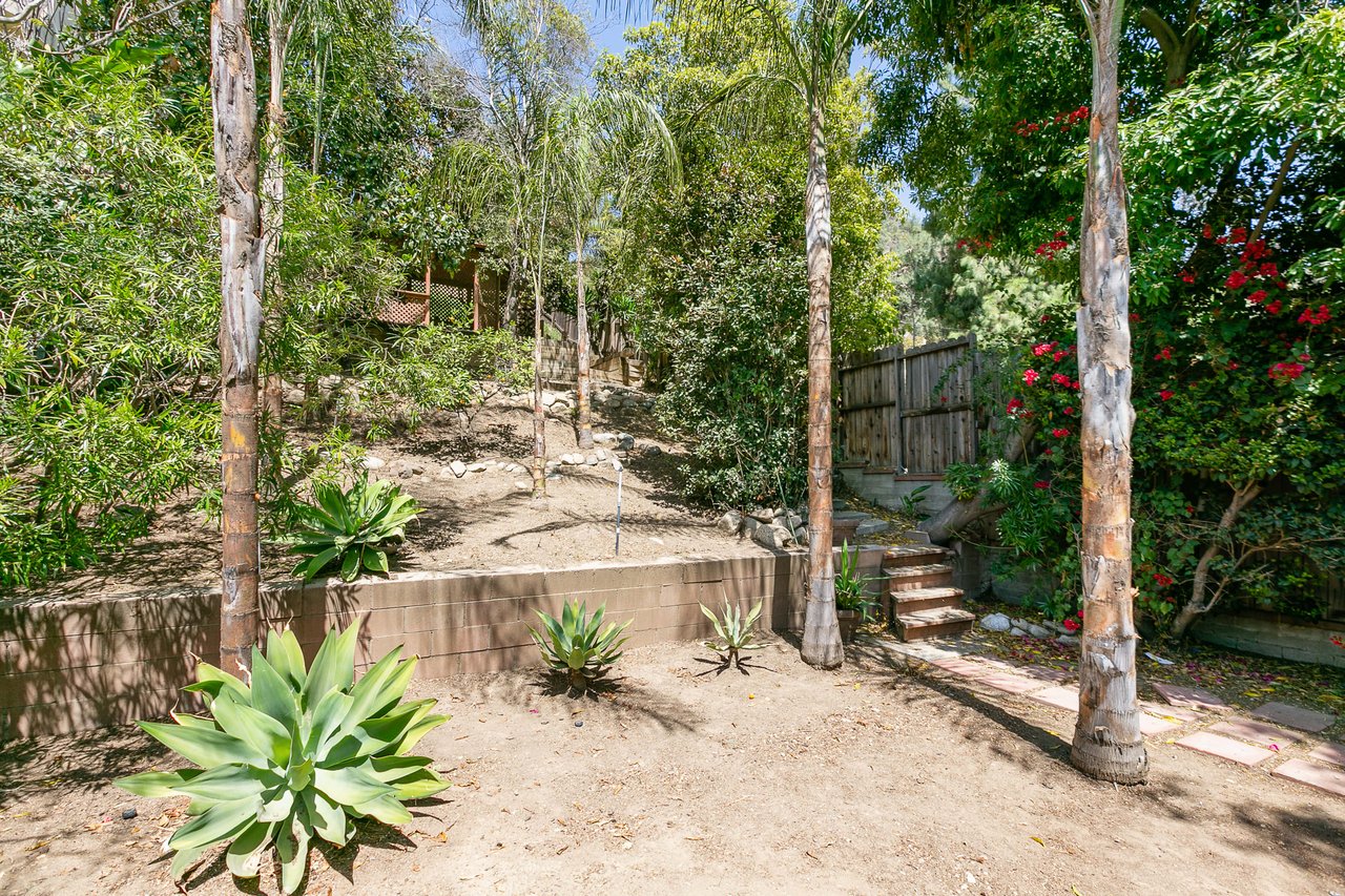 Montecito Heights Mid-Century Modern! Canopied side walkway leads to formal entry and large open plan family room featuring updated kitchen with stainless appliances. Also includes high vaulted ceiling, peninsula with breakfast bar, hardwood floors and folding doors leading right outside to large deck and flat and terraced yard. Yard includes mature trees and a shady gazebo and extends to terraces that stretch all the way up to the next street providing amazing space and privacy. Three bedrooms and two baths--with one bath en-suite and one bedroom with views overlooking the canyon. Beautiful two car garage with direct entry, and separate bonus room/office next to the garage. Amazing location--exit the freeway and in a few minutes, you are home in the rustic hills.