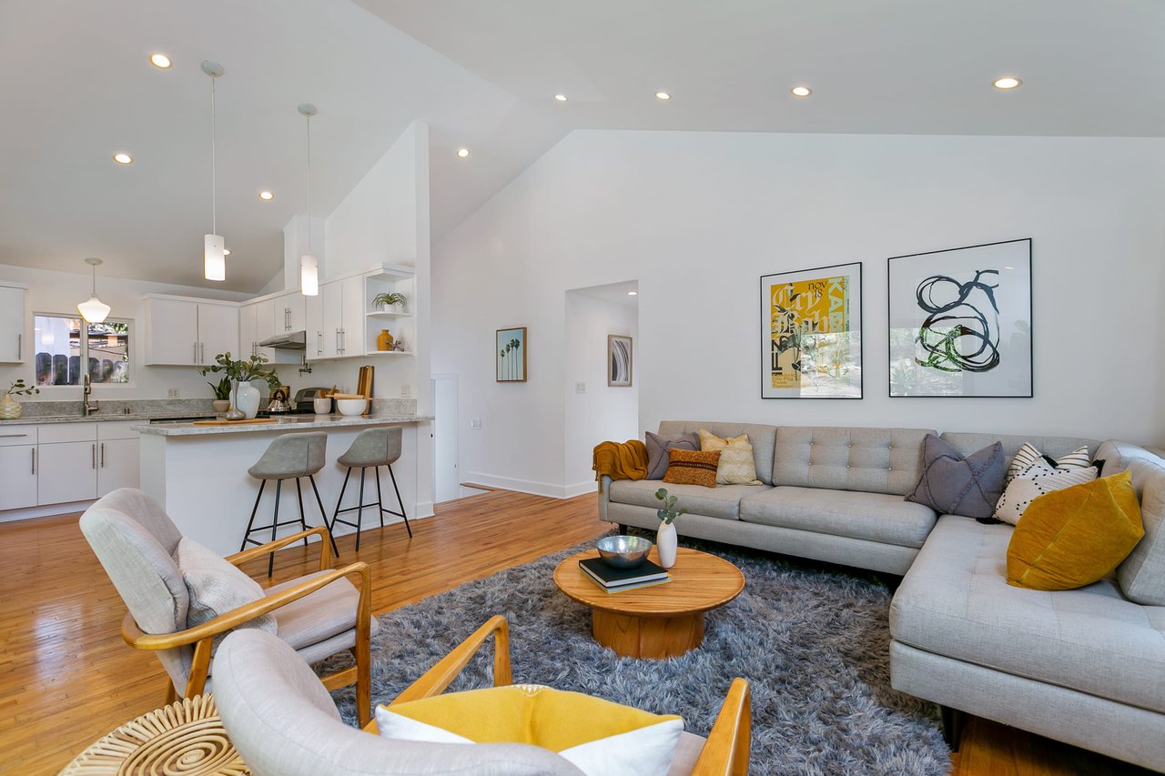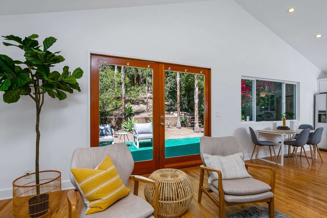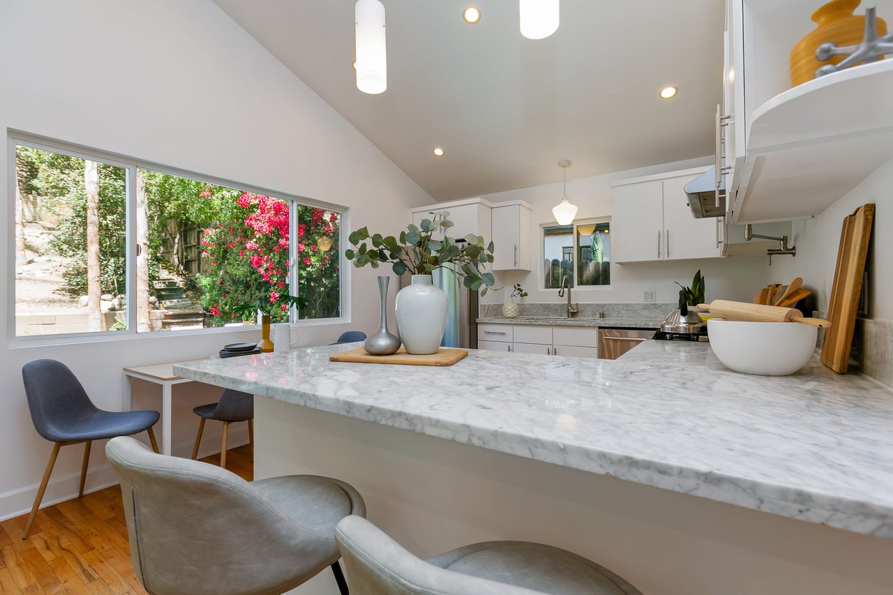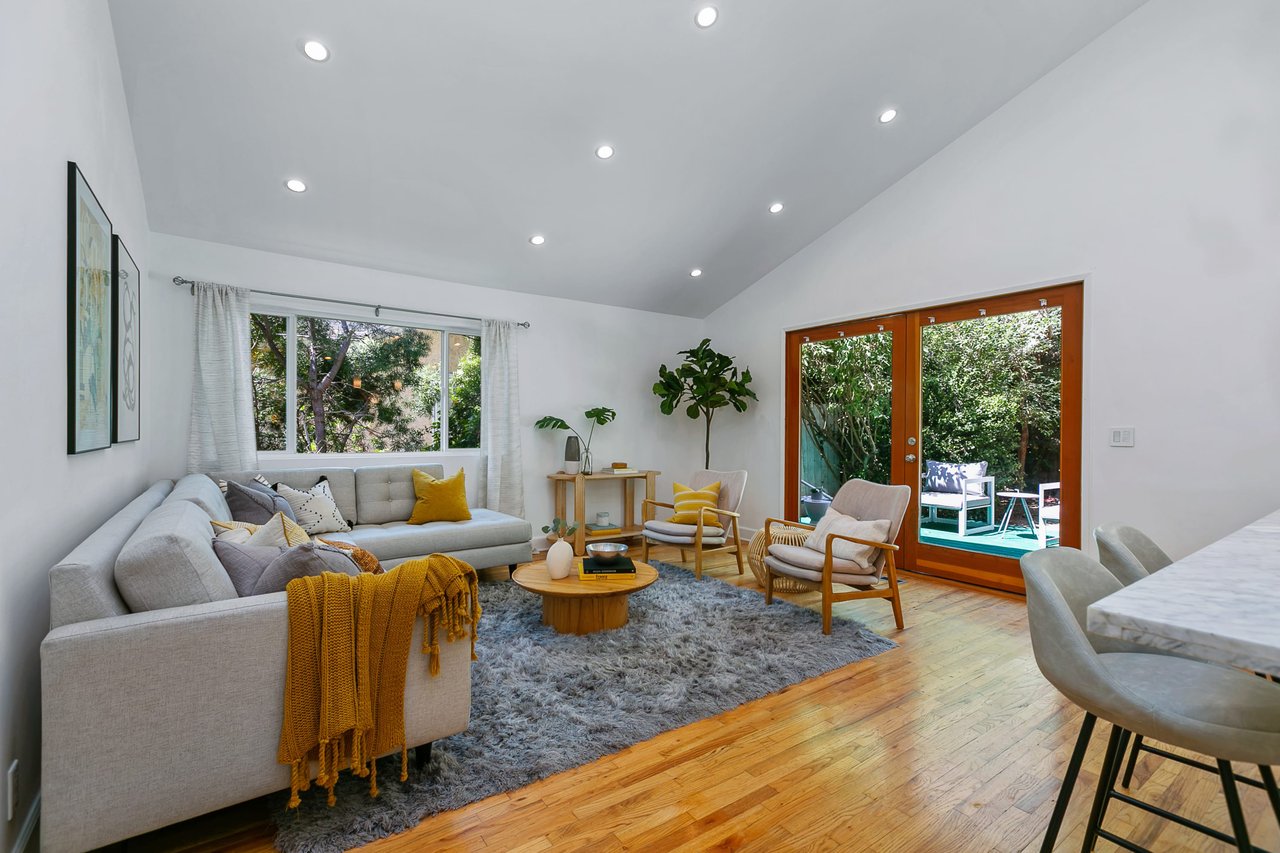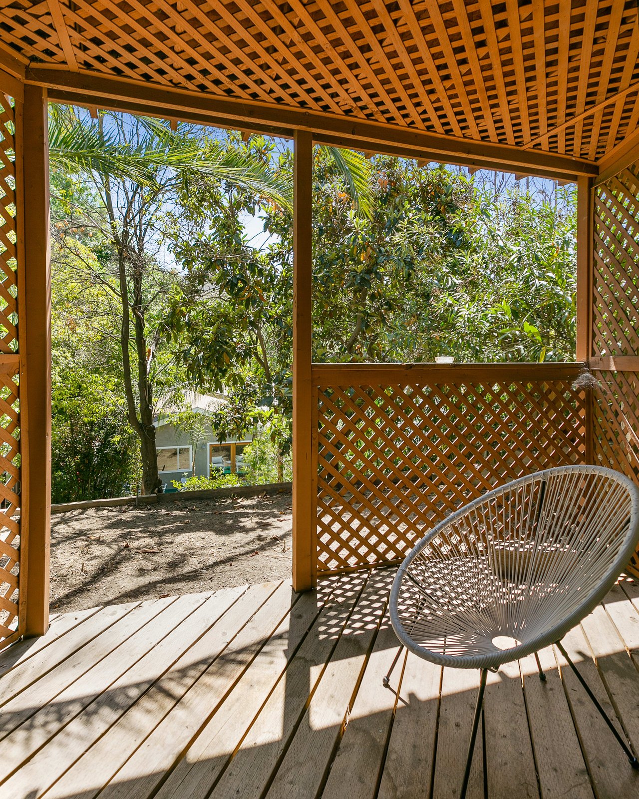 Montecito Heights Mid-Century Modern! Canopied side walkway leads to formal entry and large open plan family room featuring updated kitchen with stainless appliances. Also includes high vaulted ceiling, peninsula with breakfast bar, hardwood floors and folding doors leading right outside to large deck and flat and terraced yard. Yard includes mature trees and a shady gazebo and extends to terraces that stretch all the way up to the next street providing amazing space and privacy. Three bedrooms and two baths--with one bath en-suite and one bedroom with views overlooking the canyon. Beautiful two car garage with direct entry, and separate bonus room/office next to the garage. Amazing location--exit the freeway and in a few minutes, you are home in the rustic hills.