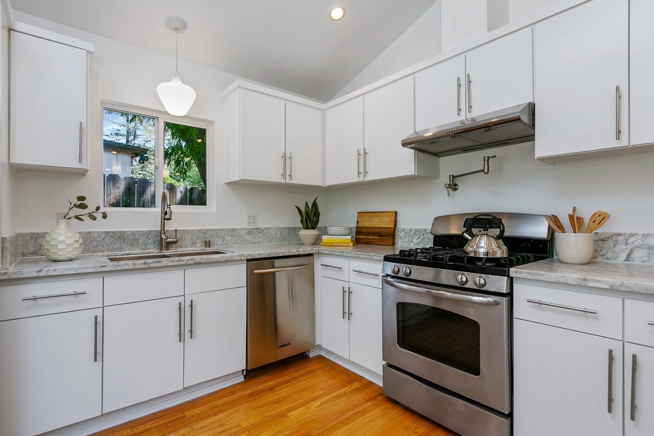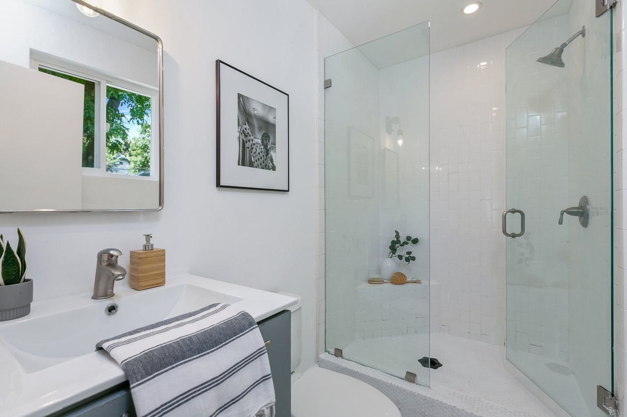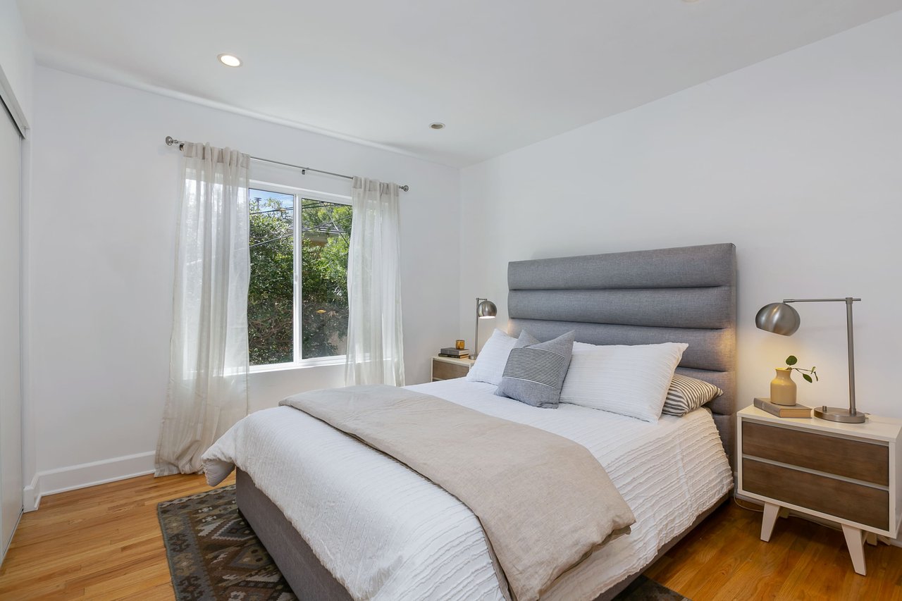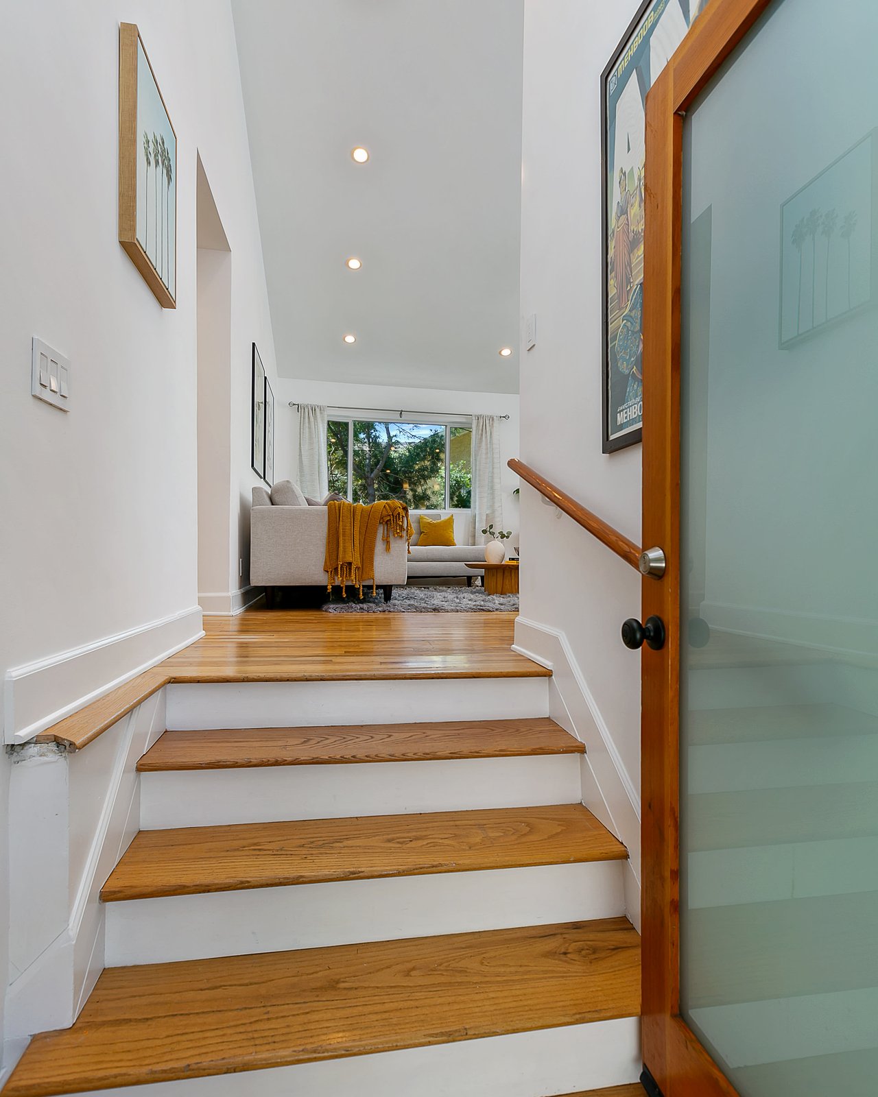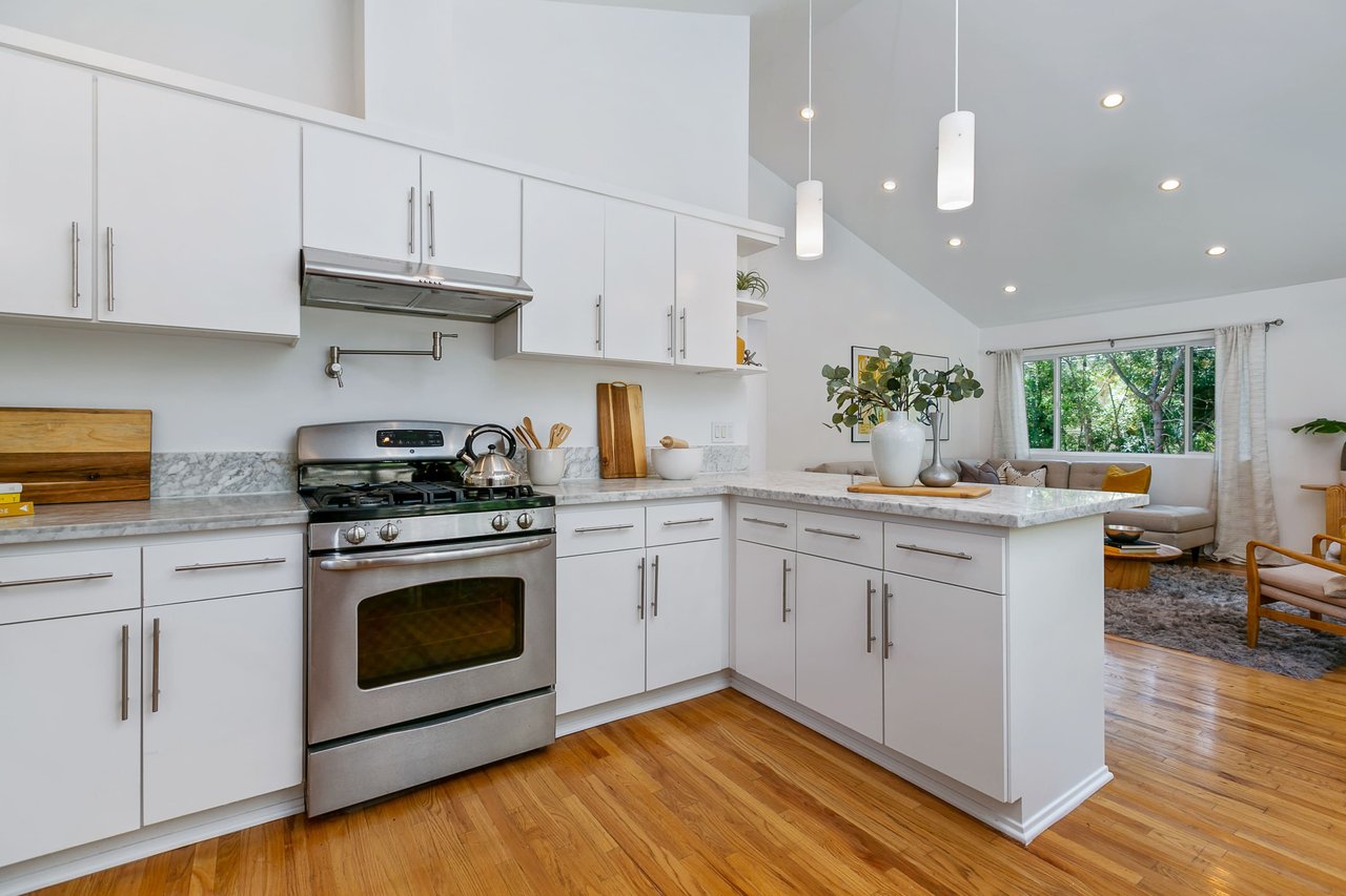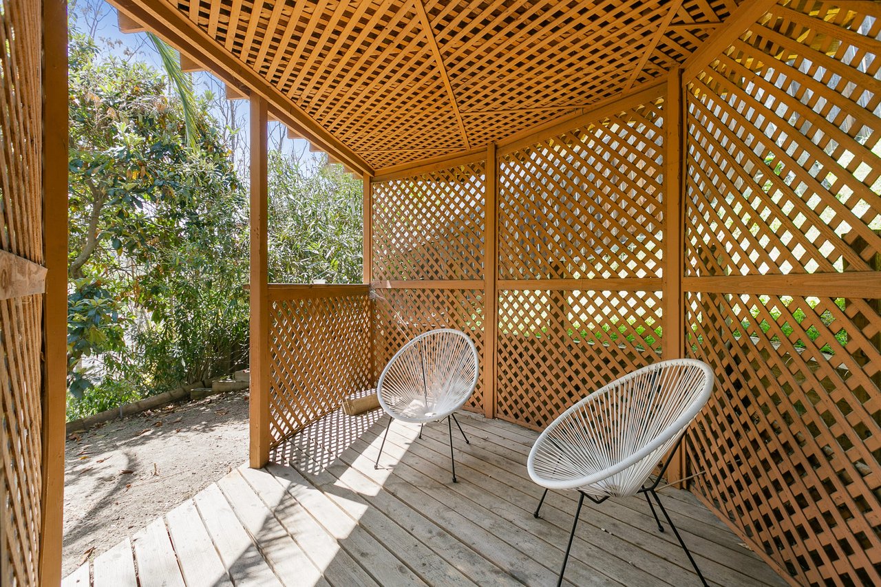 Montecito Heights Mid-Century Modern! Canopied side walkway leads to formal entry and large open plan family room featuring updated kitchen with stainless appliances. Also includes high vaulted ceiling, peninsula with breakfast bar, hardwood floors and folding doors leading right outside to large deck and flat and terraced yard. Yard includes mature trees and a shady gazebo and extends to terraces that stretch all the way up to the next street providing amazing space and privacy. Three bedrooms and two baths--with one bath en-suite and one bedroom with views overlooking the canyon. Beautiful two car garage with direct entry, and separate bonus room/office next to the garage. Amazing location--exit the freeway and in a few minutes, you are home in the rustic hills.