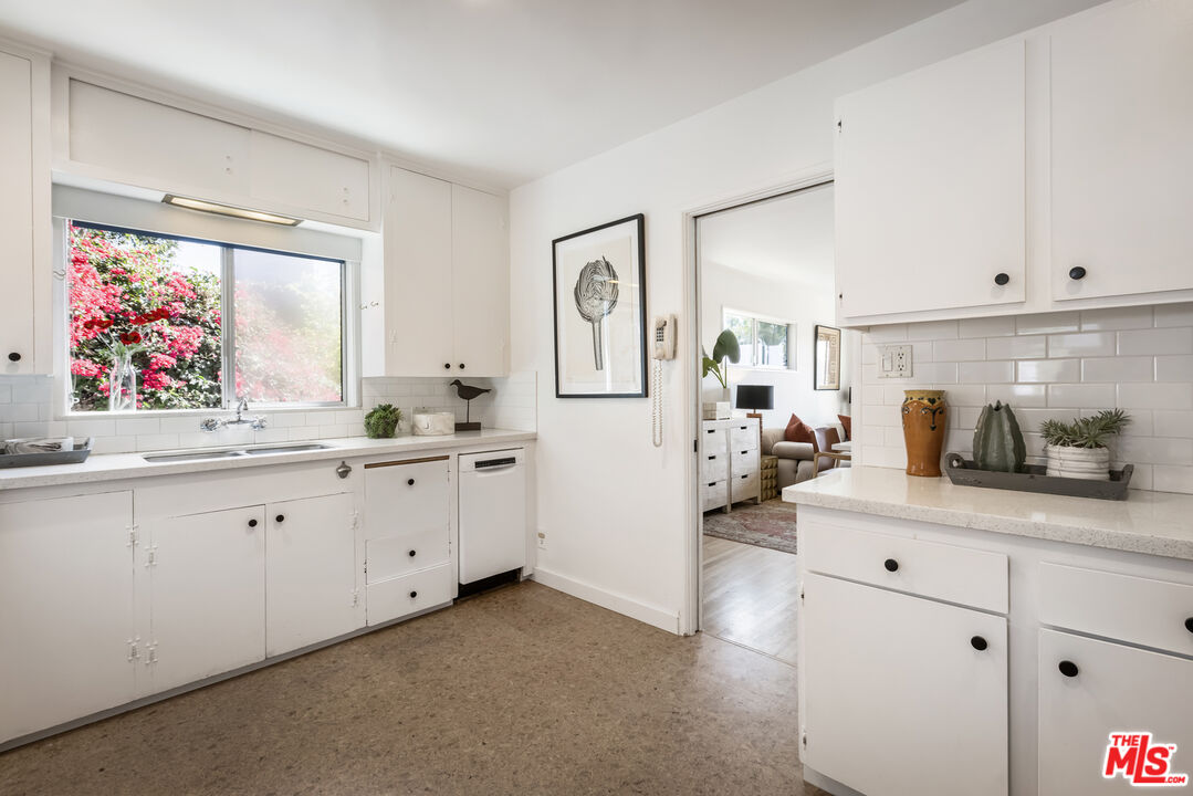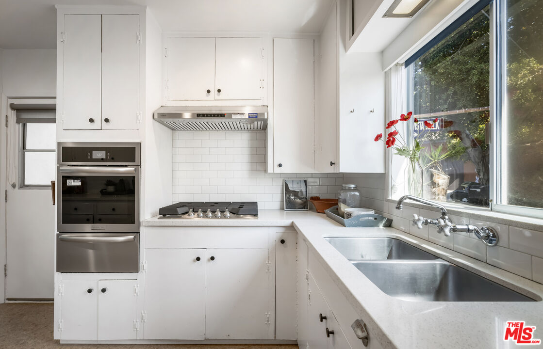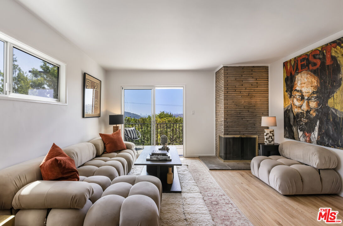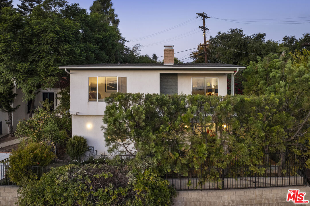 Located at the top of Mount Angelus, one of Highland Park's most coveted enclaves, this captivating c1957 Mid-Century modern home offers superb original details, endless natural sunlight, spectacular downtown skyline views, and total privacy; ensconced among tall trees on a street to street lot and feels like you have no neighbors. Enter the property from the end of the cul-de-sac at the peak of the hill on Wayland St, where there is a 2 car garage and two entrances at street level. (La Follette Drive is below the property.) Front walkway leads to main entrance and large living room with stunning character fireplace and hearth, original hardwood floors, ample dining area and spacious walk-out balcony with panoramic 180 views of greenery, architecture, and the hills-- capped by the downtown LA skyscape. Kitchen with separate entrance offers new cork floors, new appliances and cool vintage cabinetry. Featuring hardwood floors and large windows framing breathtaking views, the primary suite is spacious and private. The lower level features a large family room with abundant custom shelving from HP's Matters of Space, and two exterior entrances: one entrance to the side stairs; plus sliders opening to large deck and yard/garden--perfect for outdoor entertaining. Built-ins; ironwork, magnesite stairs, original doors and many other details give this beautiful home a true classic feel. Large laundry and utility room also opens to the outside. Explore endless local eateries like Bub and Grandmas and Joy; and walk to rec center, music venues and theaters. Feel space, privacy and nature with the city at your fingertips: centrally located to downtown, Pasadena and Glendale.