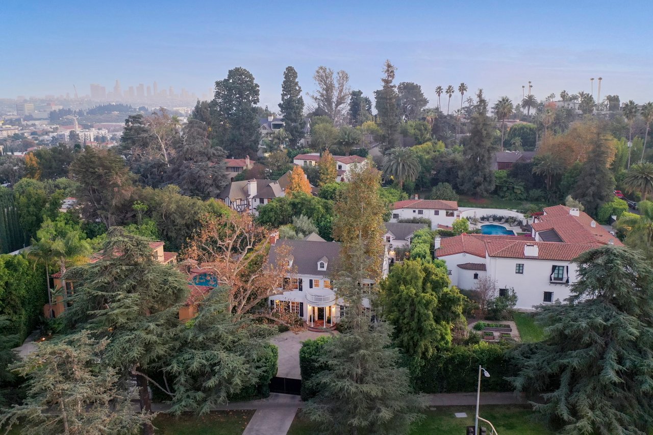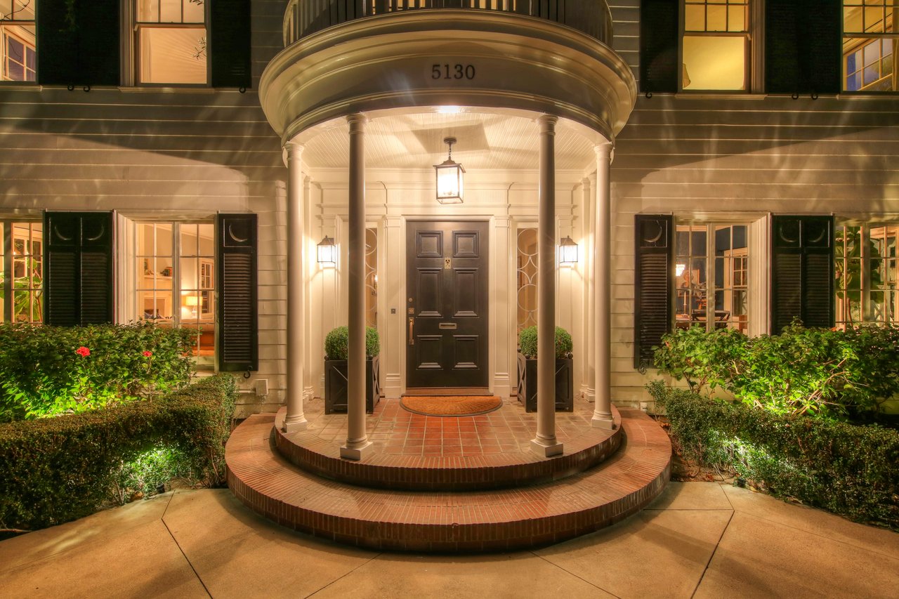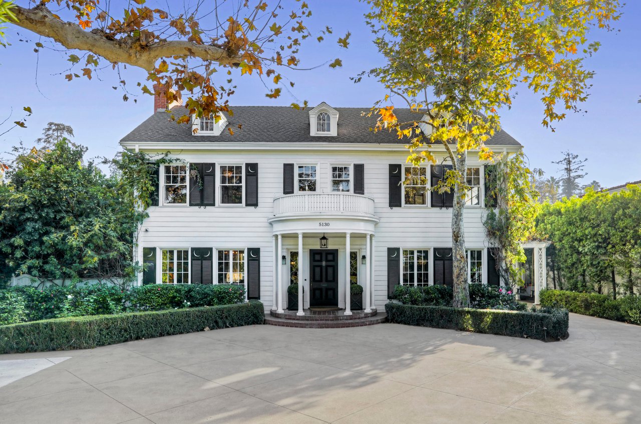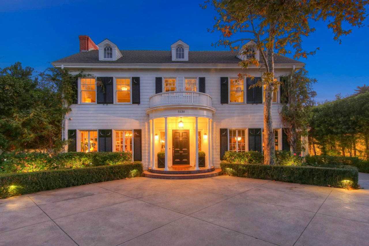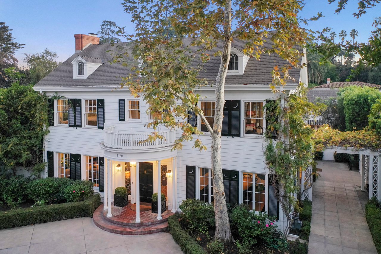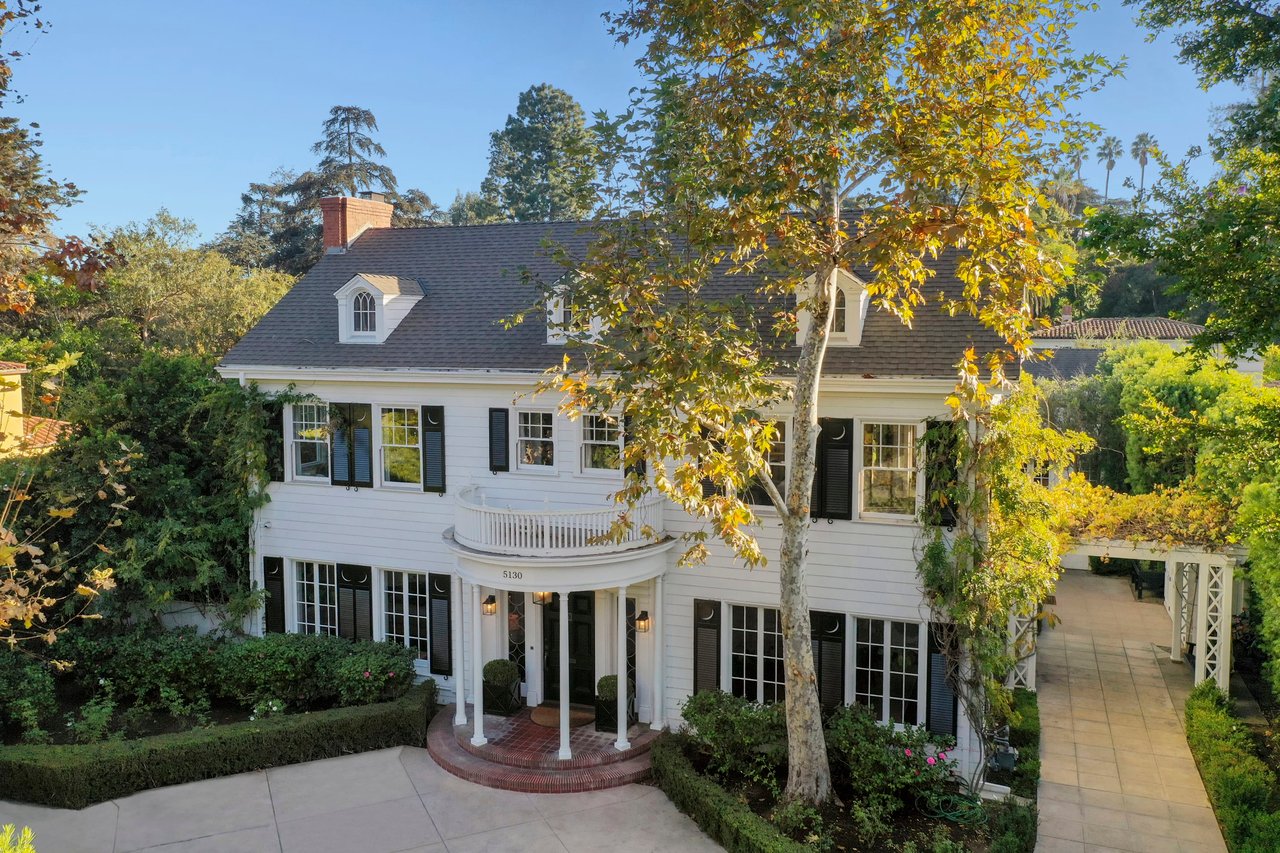 Marshall Wilkinson AIA, architect to the stars. Shrouded by tall hedges behind gates for privacy adjacent to Laughlin Park, this 1920's mini-compound is one of the finest examples of unspoiled Colonial architecture: with details, craftsmanship and a soul that you will only find in a vintage home. Motor court leads to portico entry and massive center hall with grand staircase flooded with sunlight. Chic and classic stylings elevate living room with fireplace, formal dining room and sun/TV room. Updated chef's eat-in kitchen leads to breakfast room, laundry room and full maid's suite. Upstairs are 4 more bedrooms including gorgeous primary suite--and on the third level is a bonus suite. Garage is converted to a stunning family entertainment center plus full guest apartment upstairs. Newer pool and yard with mature landscape are totally private. An experience that lights the spirit and soothes the senses--creating an unforgettable atmosphere of blissful country life in the city.
