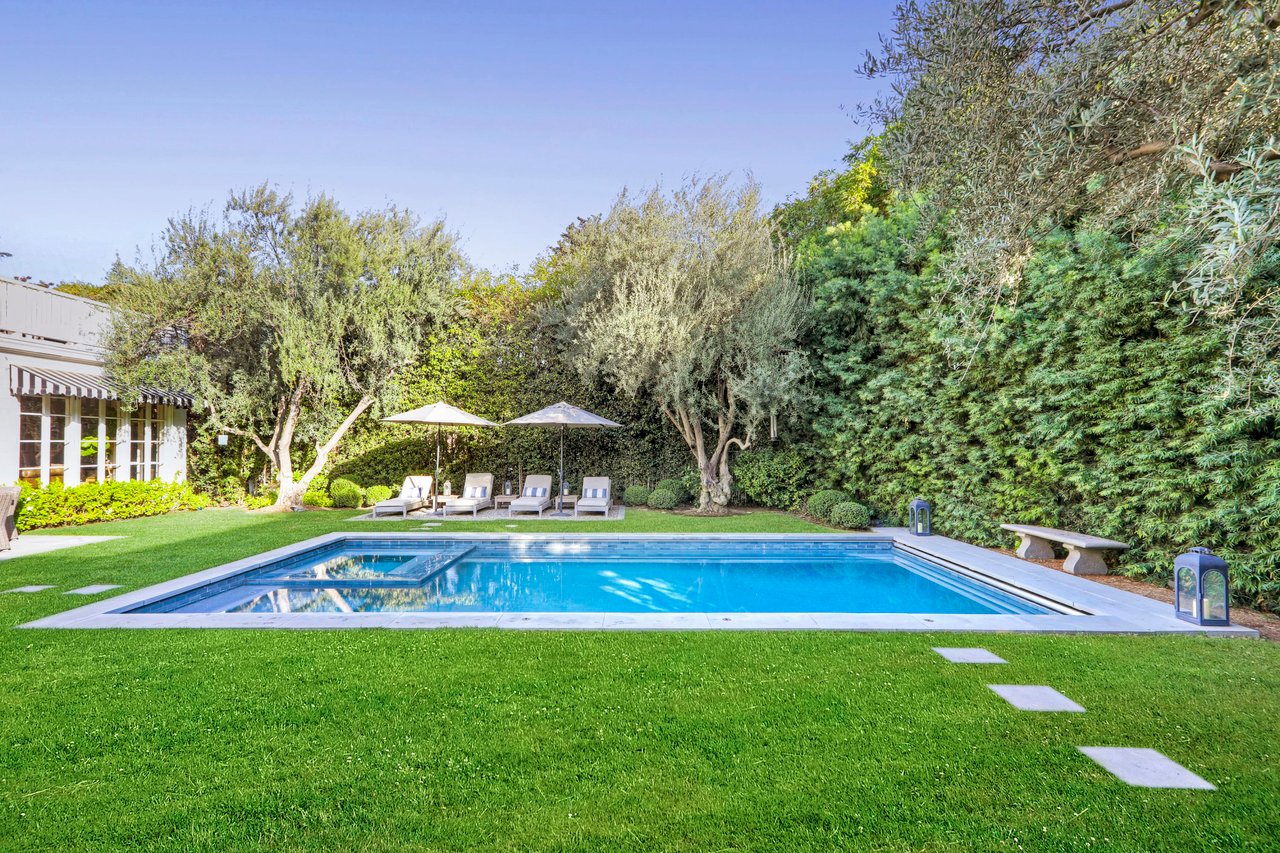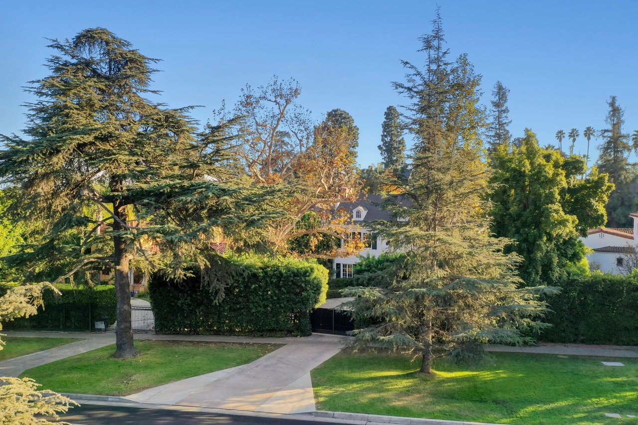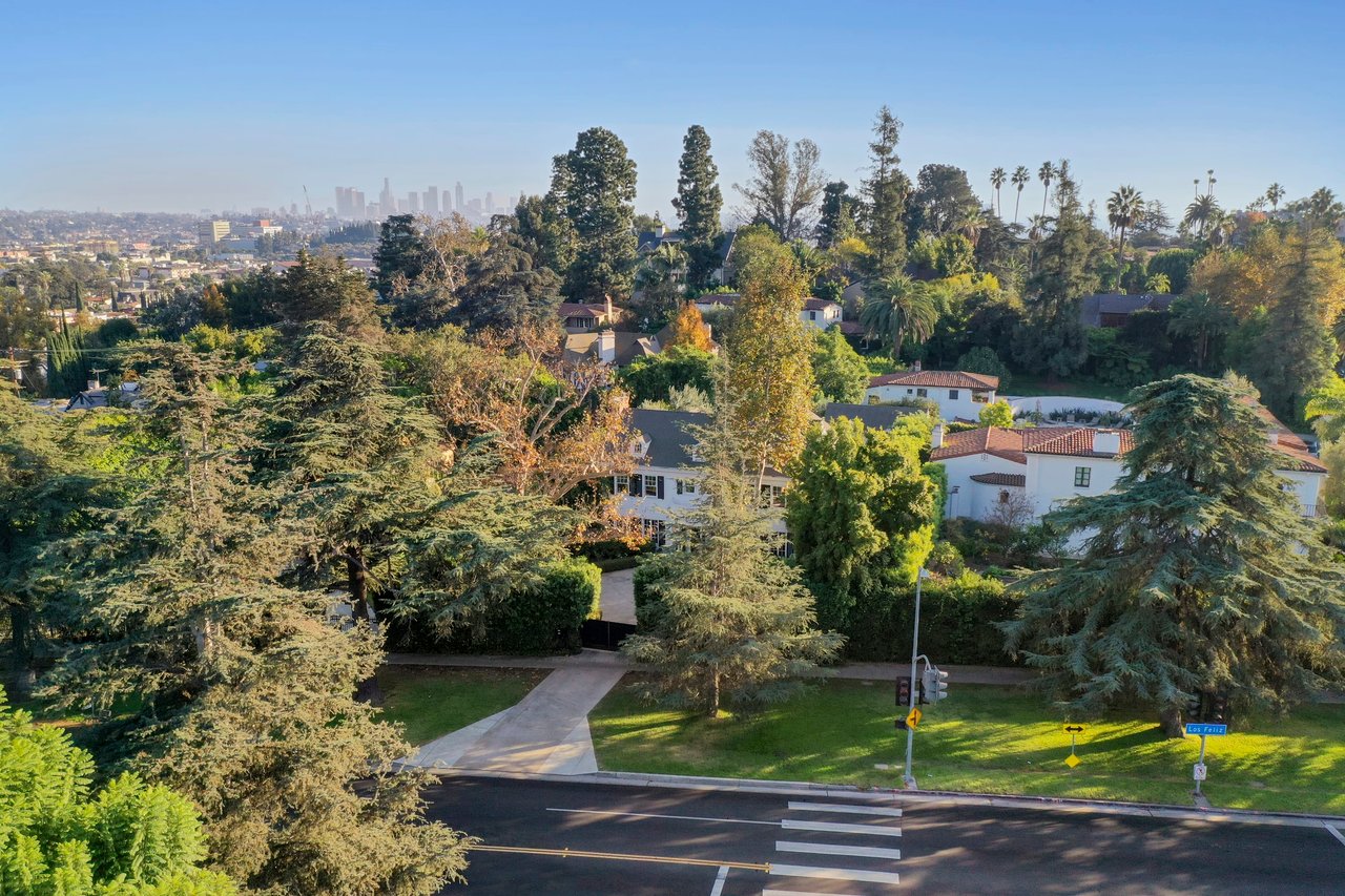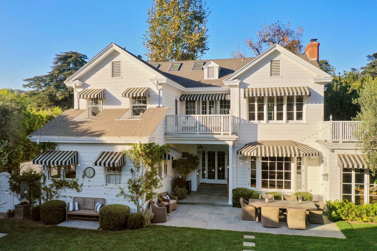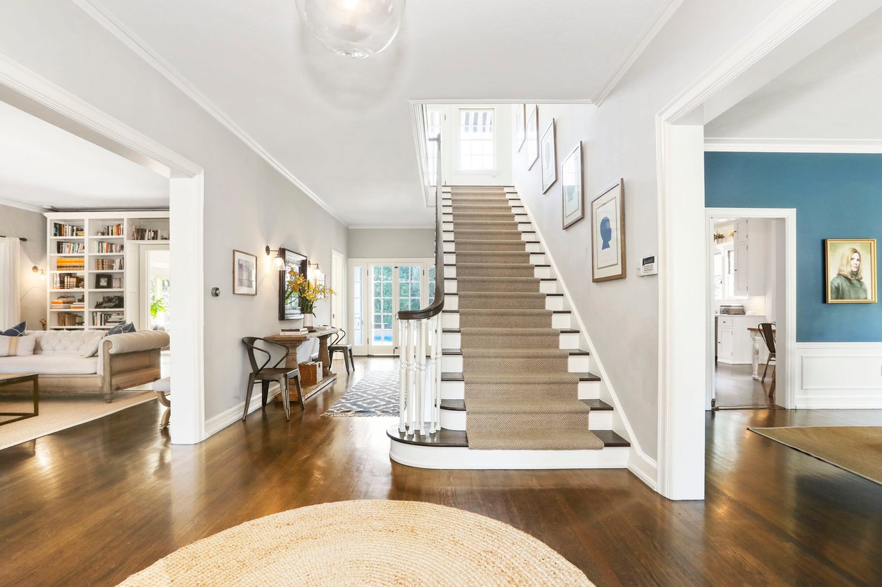 Marshall Wilkinson AIA, architect to the stars. Shrouded by tall hedges behind gates for privacy adjacent to Laughlin Park, this 1920's mini-compound is one of the finest examples of unspoiled Colonial architecture: with details, craftsmanship and a soul that you will only find in a vintage home. Motor court leads to portico entry and massive center hall with grand staircase flooded with sunlight. Chic and classic stylings elevate living room with fireplace, formal dining room and sun/TV room. Updated chef's eat-in kitchen leads to breakfast room, laundry room and full maid's suite. Upstairs are 4 more bedrooms including gorgeous primary suite--and on the third level is a bonus suite. Garage is converted to a stunning family entertainment center plus full guest apartment upstairs. Newer pool and yard with mature landscape are totally private. An experience that lights the spirit and soothes the senses--creating an unforgettable atmosphere of blissful country life in the city.