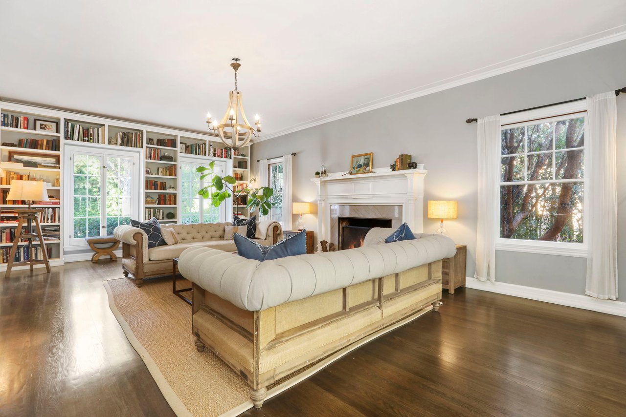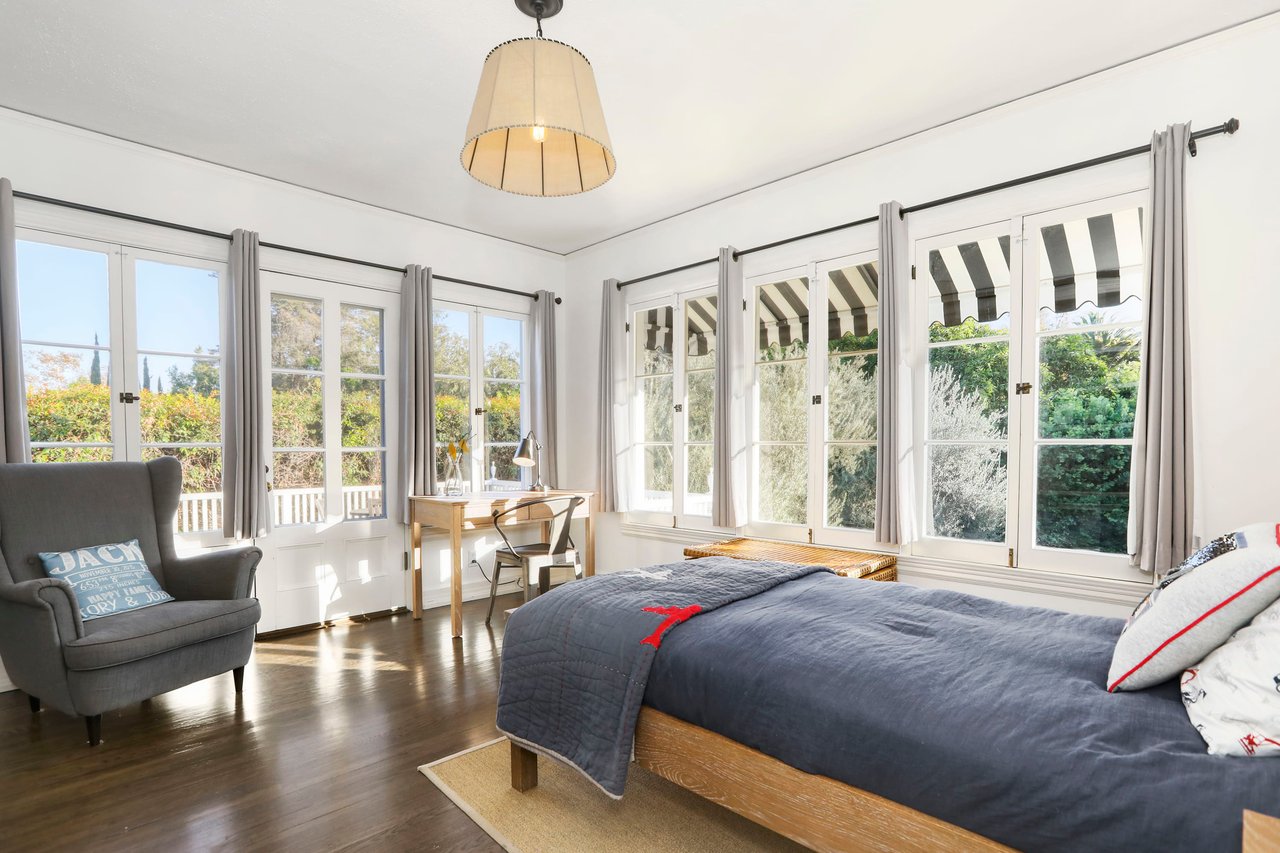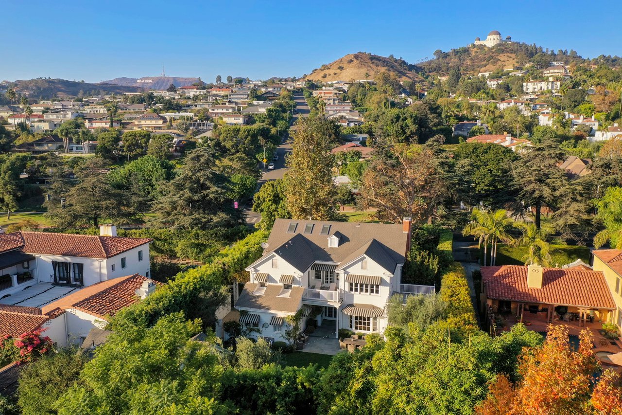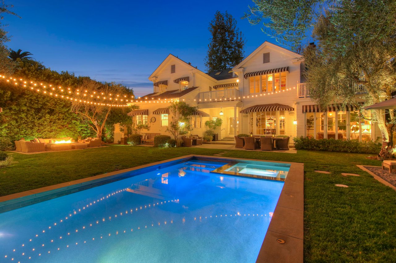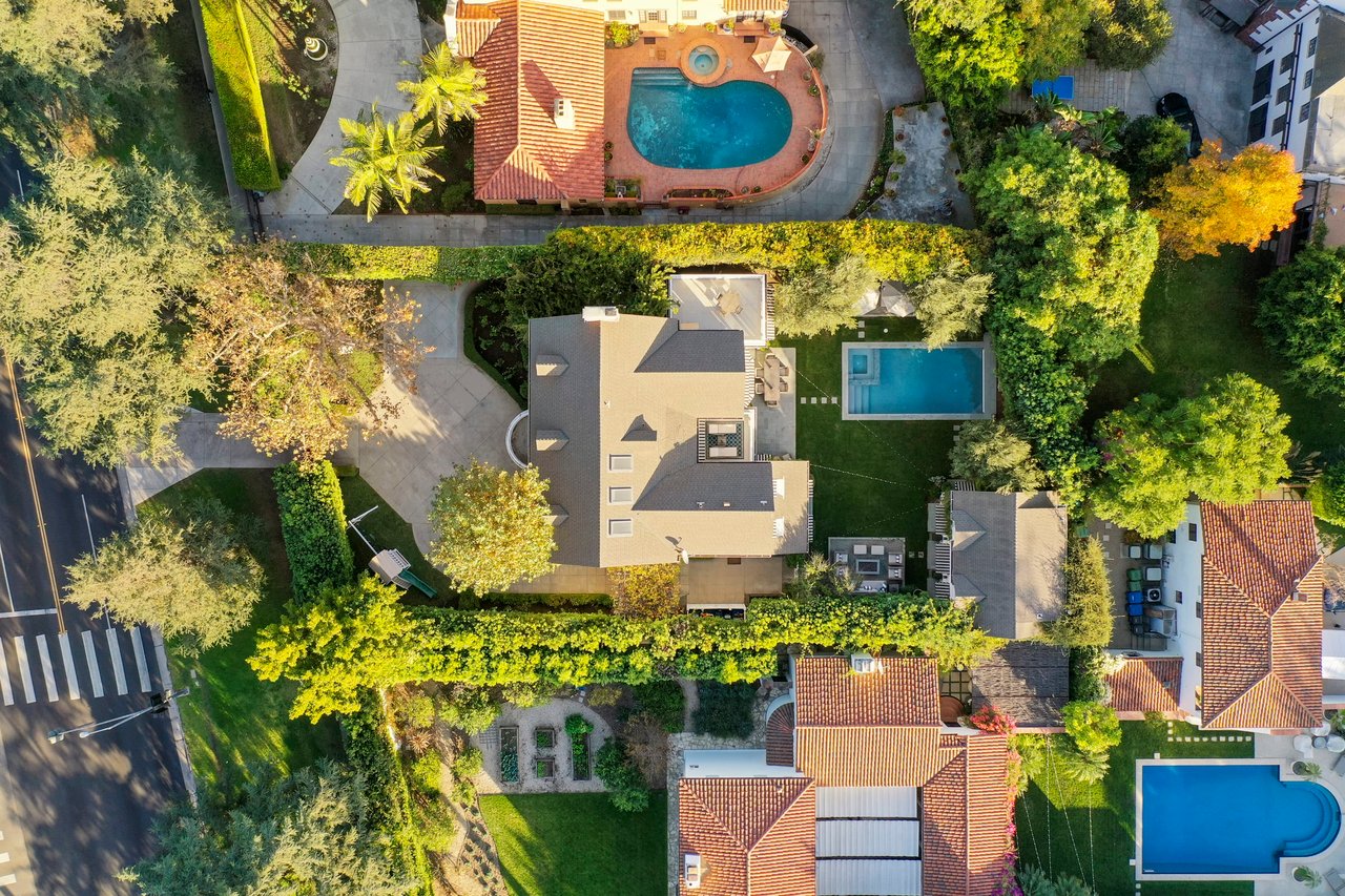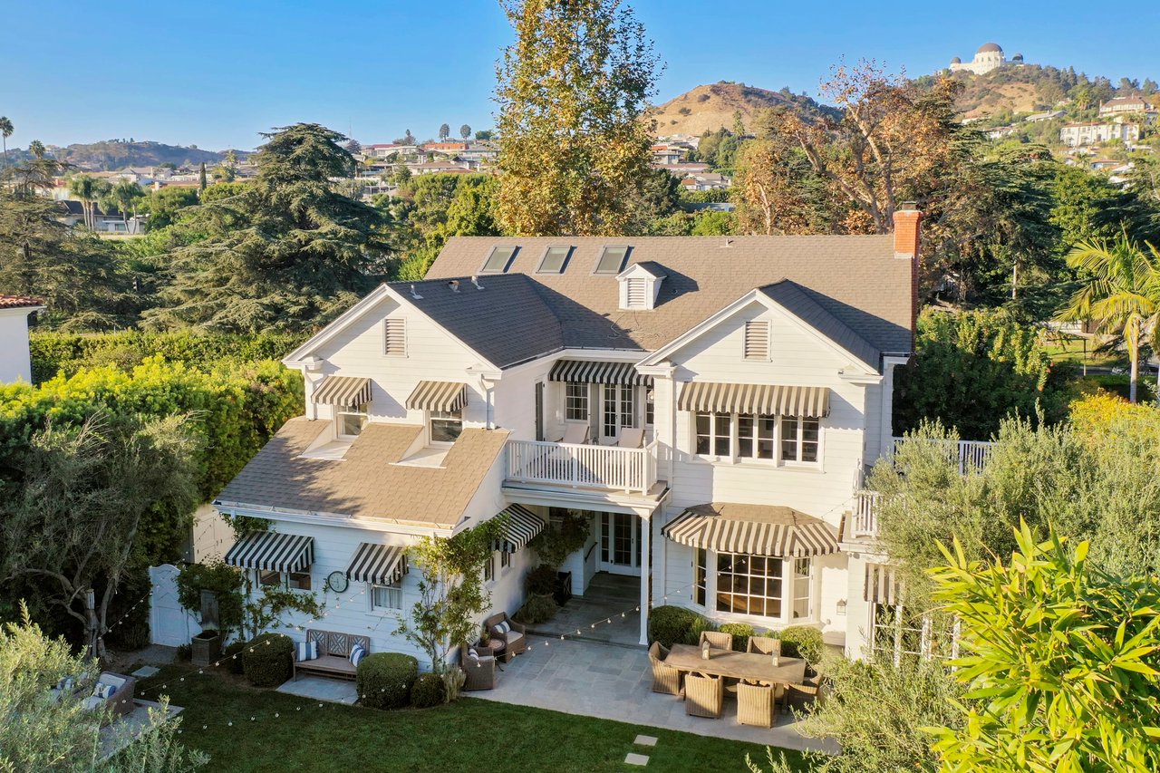 Marshall Wilkinson AIA, architect to the stars. Shrouded by tall hedges behind gates for privacy adjacent to Laughlin Park, this 1920's mini-compound is one of the finest examples of unspoiled Colonial architecture: with details, craftsmanship and a soul that you will only find in a vintage home. Motor court leads to portico entry and massive center hall with grand staircase flooded with sunlight. Chic and classic stylings elevate living room with fireplace, formal dining room and sun/TV room. Updated chef's eat-in kitchen leads to breakfast room, laundry room and full maid's suite. Upstairs are 4 more bedrooms including gorgeous primary suite--and on the third level is a bonus suite. Garage is converted to a stunning family entertainment center plus full guest apartment upstairs. Newer pool and yard with mature landscape are totally private. An experience that lights the spirit and soothes the senses--creating an unforgettable atmosphere of blissful country life in the city.