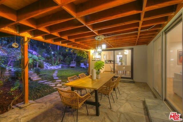 Shangri-La In Hollywoodland! Cool Mid-Century Modern circa 1957 with one of the most amazing lush walk-out yards in the whole area. A floating iron and stone staircase leads to private front entry. Living room features hardwood floors, fireplace and sliders on both sides flowing outdoors to decks and patios. Cook's kitchen with side service entry opens to spacious dining area. Dual sliders lead to huge back yard with large flat grassy area and spa, plus stunning waterfall/pond. Numerous pathways meander through the hillside leading to multiple destinations including a reading/lounging gazebo; rooftop view deck overlooking the canyon and hidden mini cabin tree-house for yoga, meditation and writing. Over two dozen specimens of fruit trees including fig, mango, citrus, cherry and black olive. Separate area for herb and vegetable gardens all located in a peaceful canyon setting.